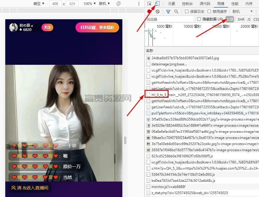浏览器打开直播间,F12进入调试模式 ,箭头指向设置好,复制HJ开头的链接即可 。