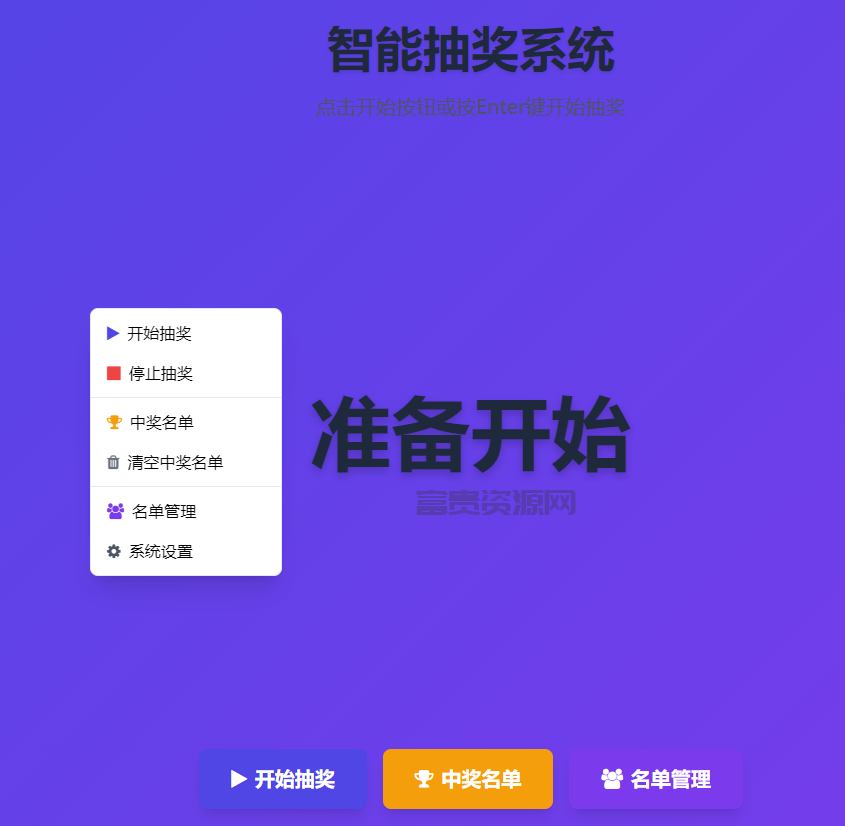 系统采用现代化UI设计,包含主抽奖界面 、名单管理界面、中奖名单界面和设置界面 ,所有界面均支持响应式布局,适配各种屏幕尺寸。