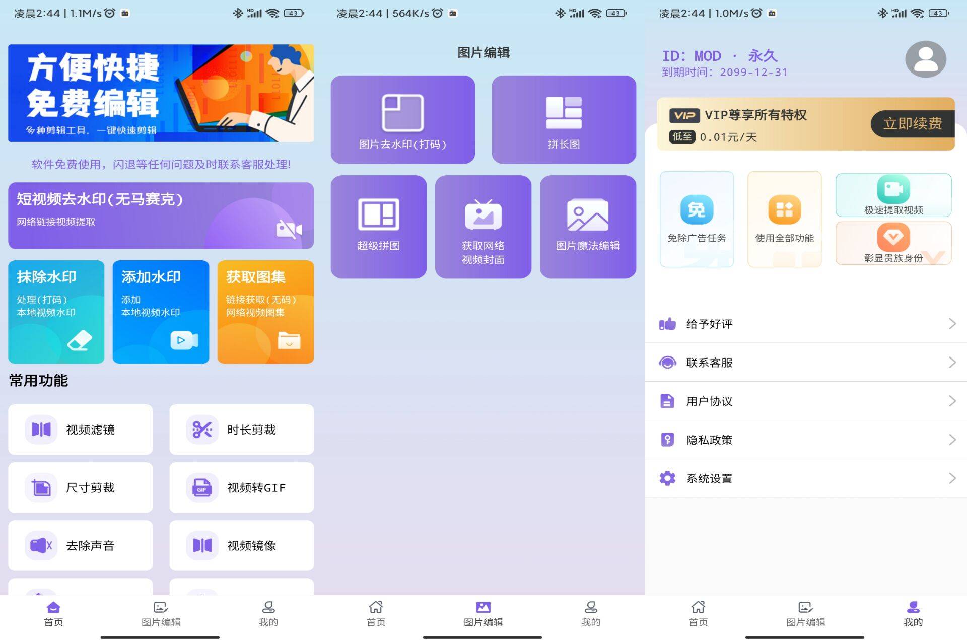 一款短视频全自动智能处理APP 。提供多素材混剪,一键解析出无水印视频 ,